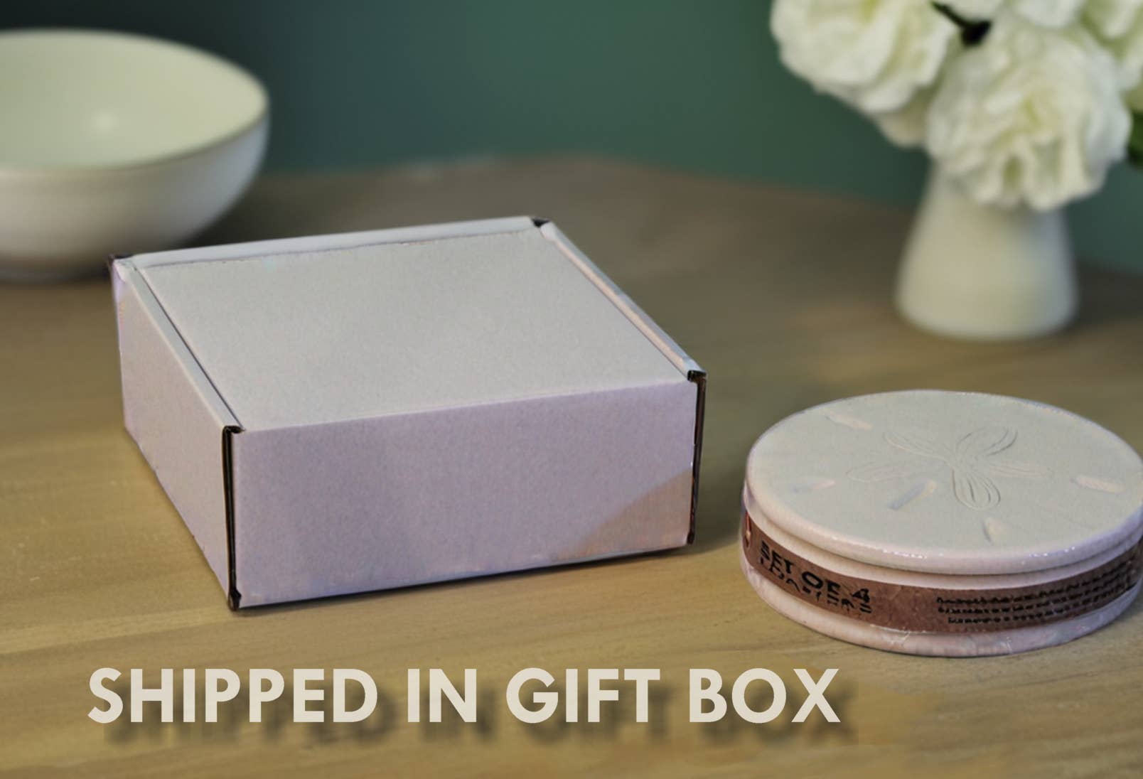 McCarter Coasters naturally absorb moisture while the cork feet protect your furniture. All the moisture disappears and the coaster will never stick to your glass. The fine textured detail is embossed giving them dimension, and the natural color goes with any decor.