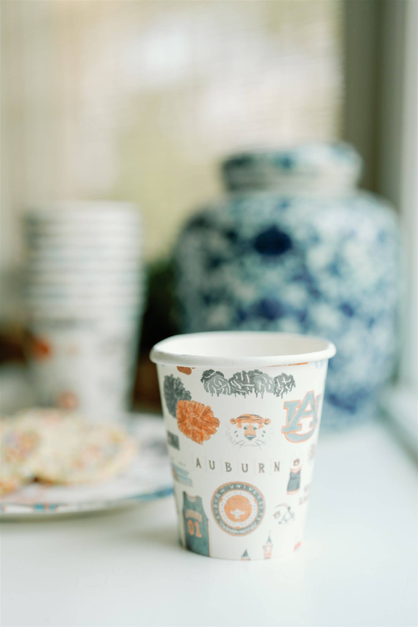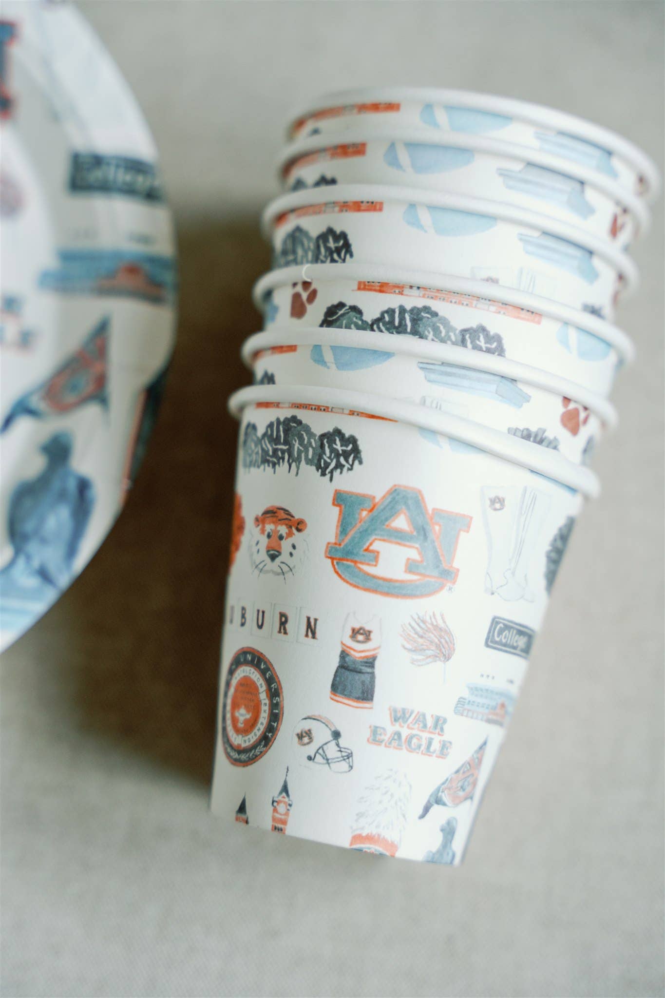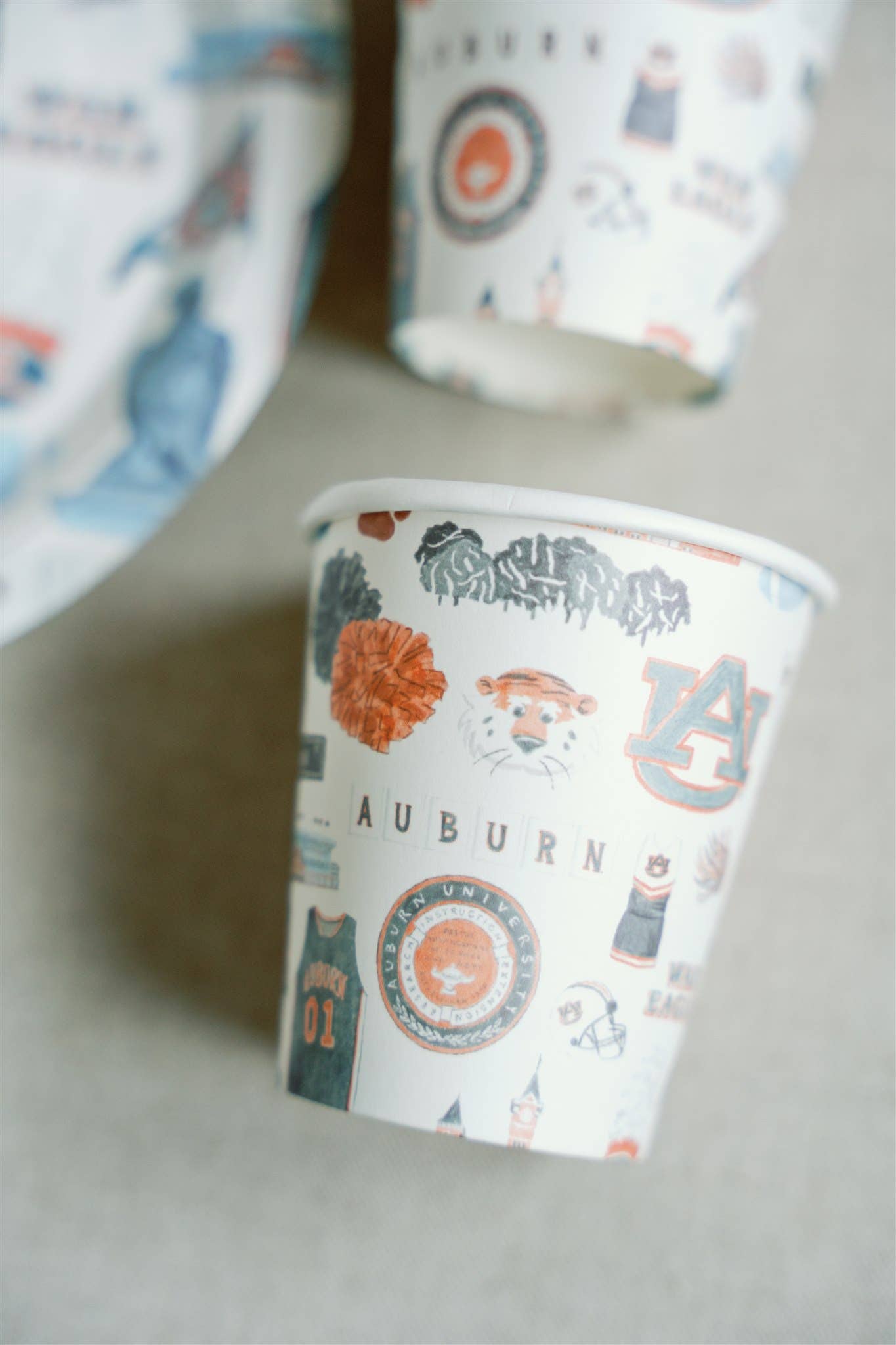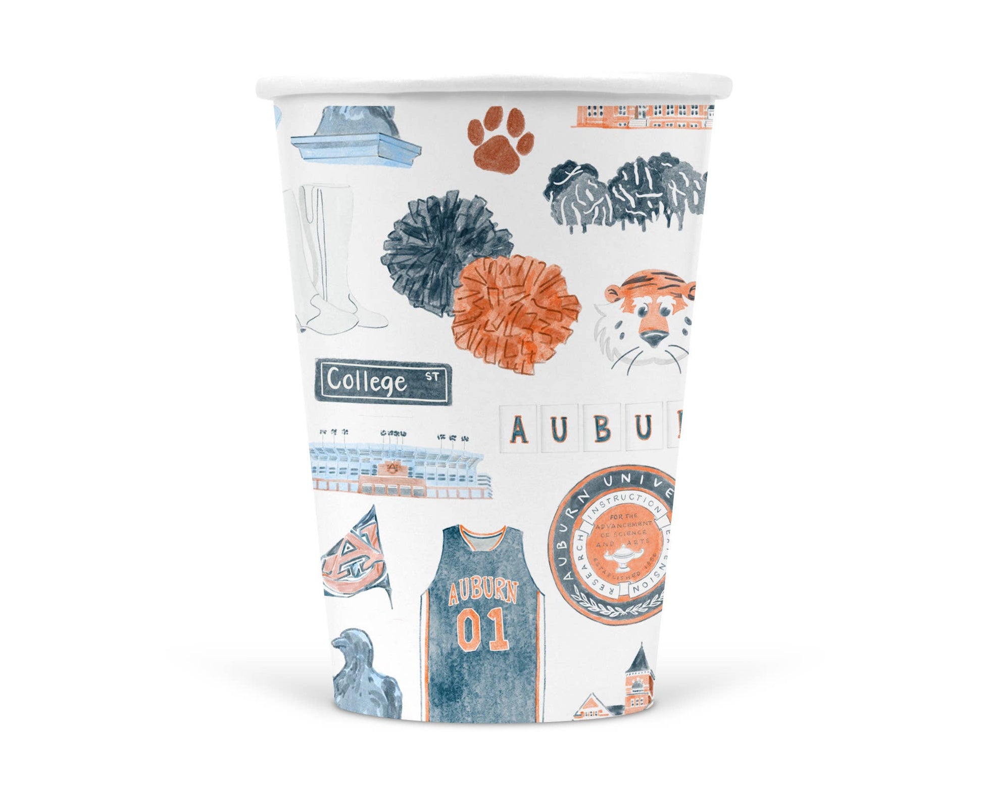 10.5 oz MATTE paper cups featuring Auburn icons, such as Aubie the tiger, Jordan-Hare Stadium, Samford Hall, the Auburn seal, and more in watercolor!