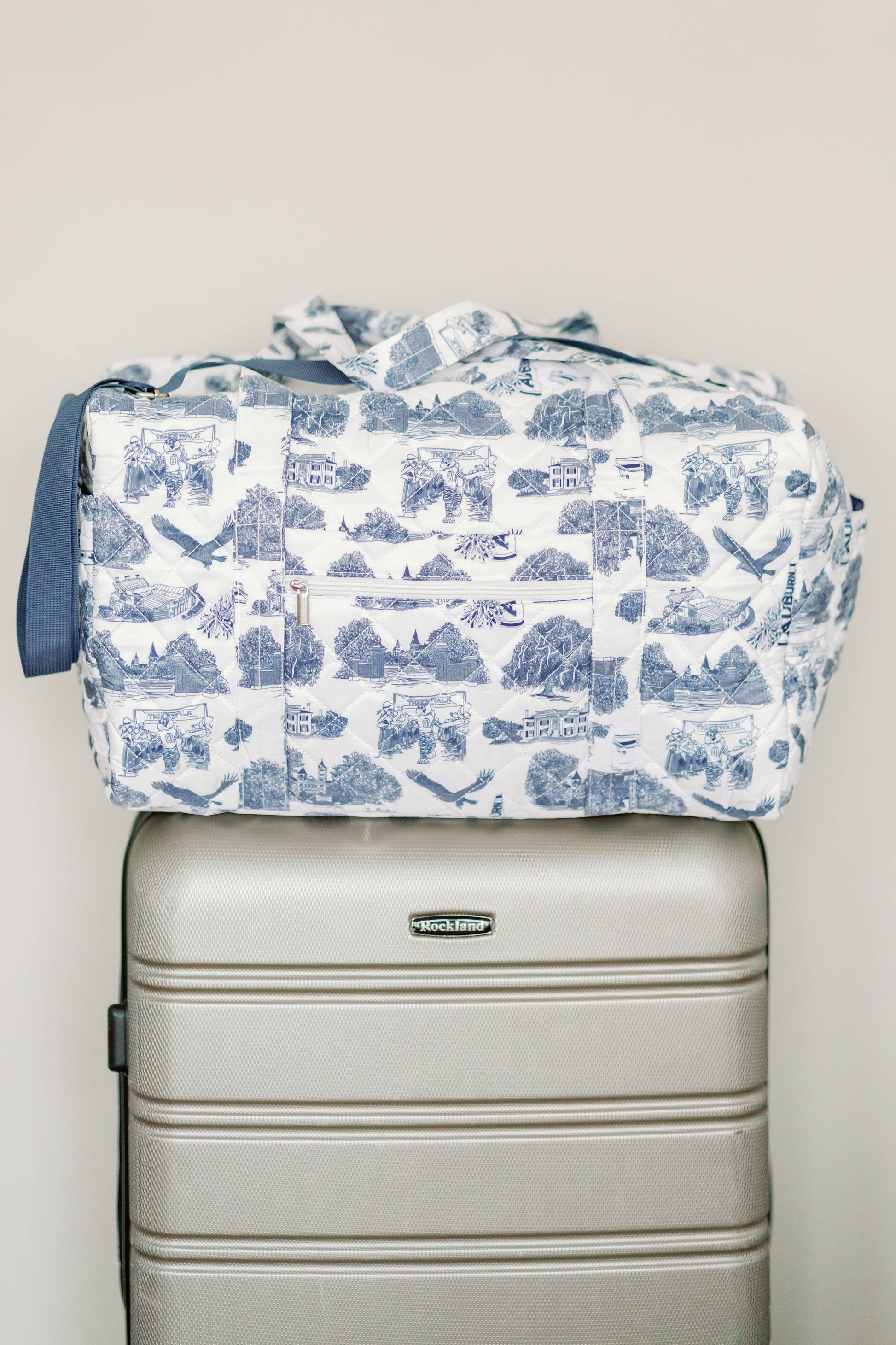 Our quilted Auburn duffle is the perfect blend of practicality and school spirit. Featuring iconic Auburn landmarks and symbols in a charming, detailed print, this bag is a stylish way to show off your love for the university. Its spacious interior and durable quilted fabric make it ideal for travel, sports events, or everyday use, while the comfortable straps ensure easy carrying. Whether you’re heading to class or the game, this duffle brings a touch of Auburn pride to your day.