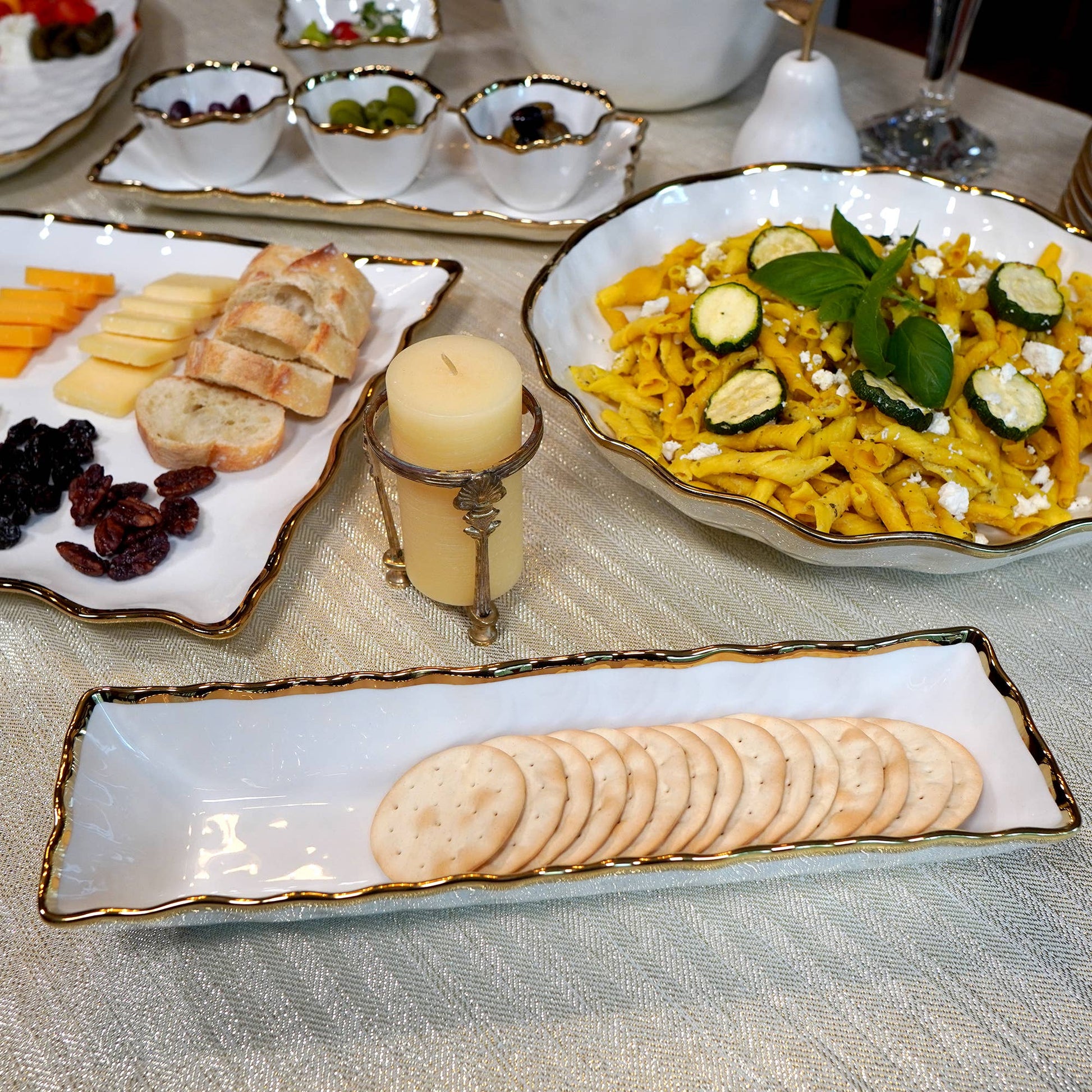 The Regency Gold Cracker Tray is a must-have for any host or hostess. Its sleek design and elegant gold detailing make it perfect for serving crackers, breadsticks, or other appetizers. This tray not only adds a touch of sophistication to your table but also ensures that your snacks are presented in style.