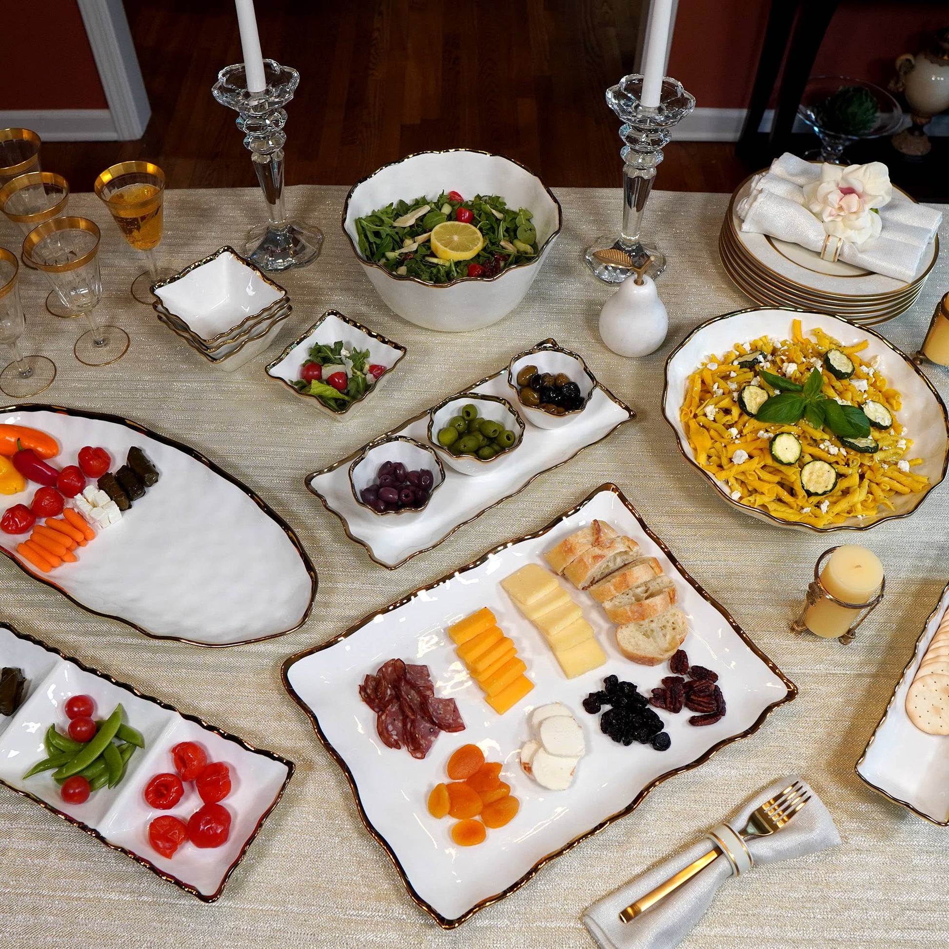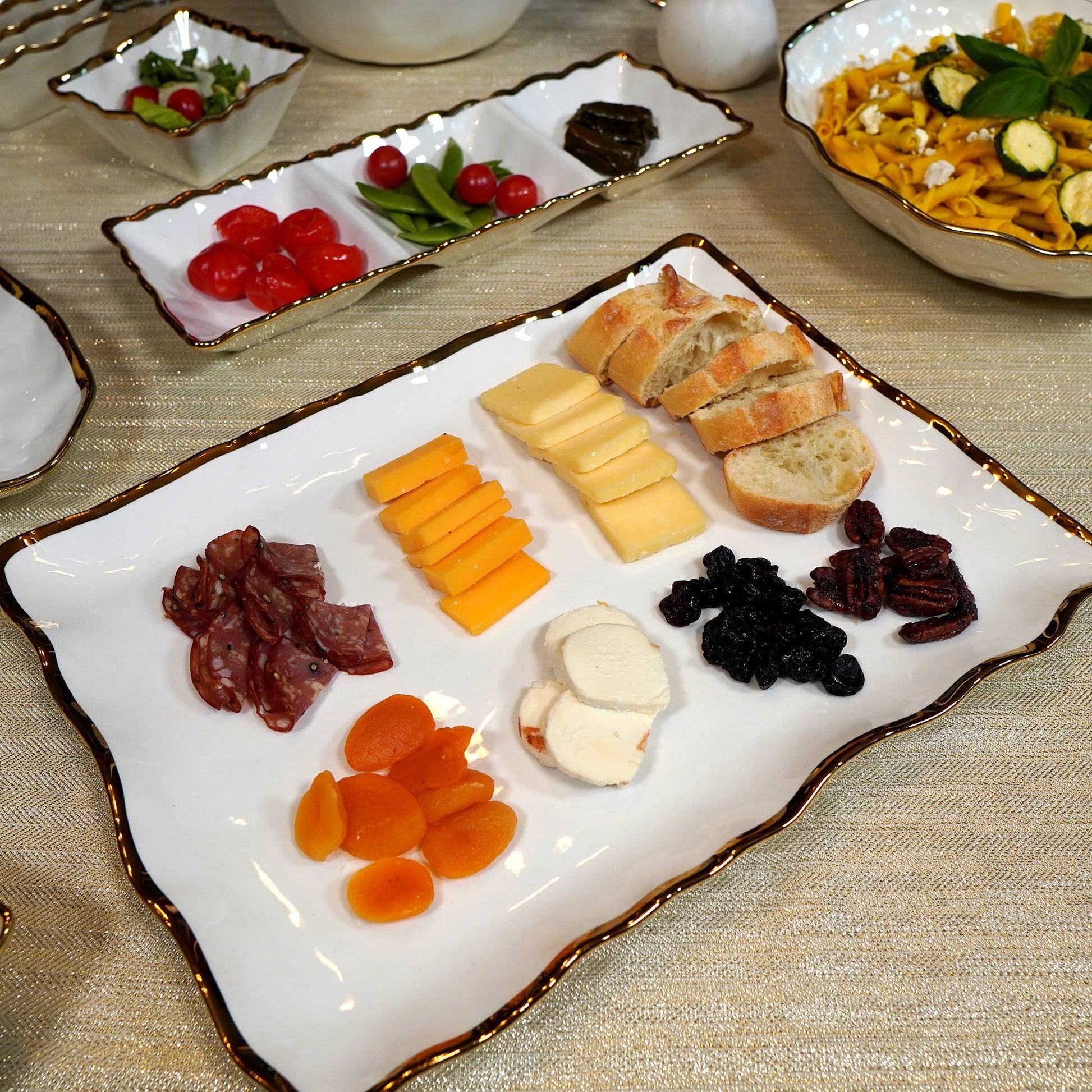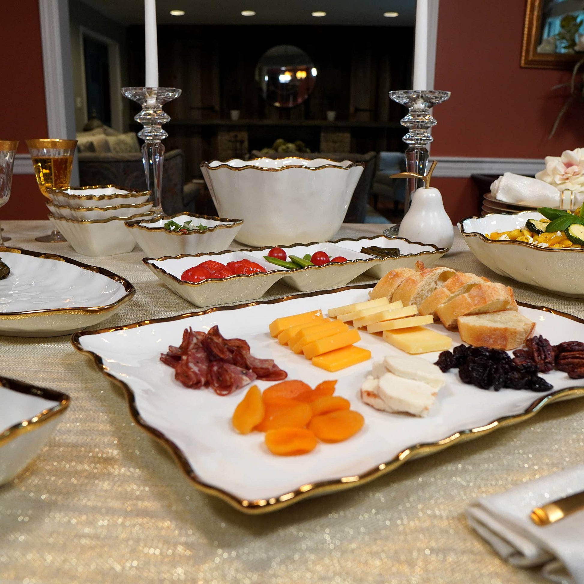 Elevate your dining experience with the Regency Gold Rectangular Platter, a perfect blend of elegance and functionality. This exquisite platter, adorned with a luxurious gold trim, is ideal for serving appetizers, main courses, or desserts, making every meal a grand affair. Whether you're hosting a formal dinner party or a casual family gathering, this platter adds a touch of sophistication to your table setting.