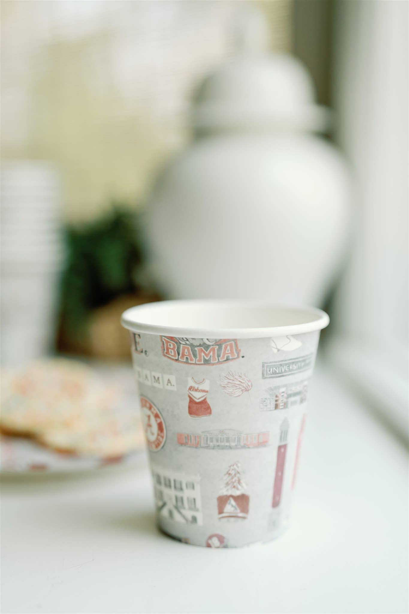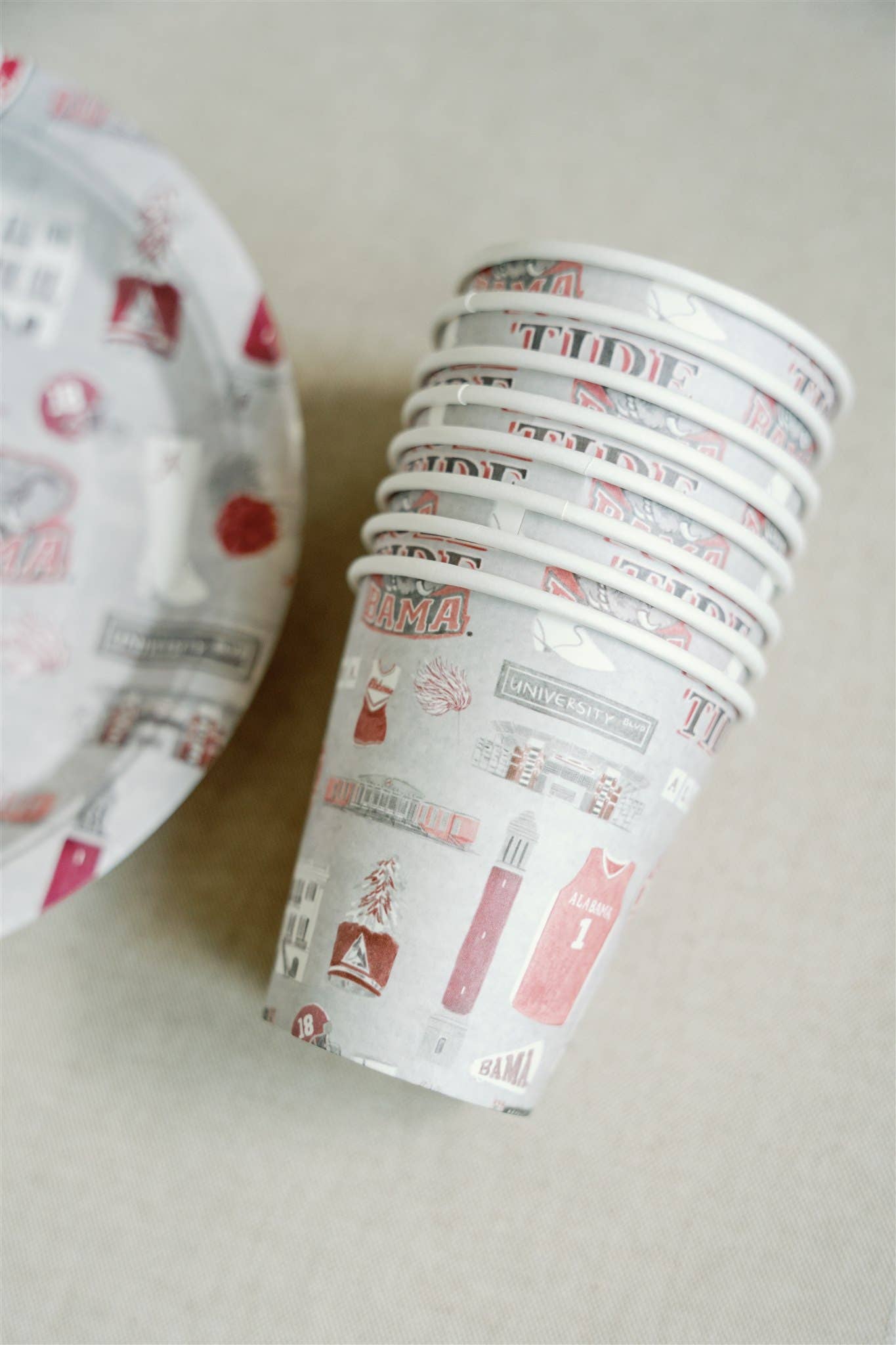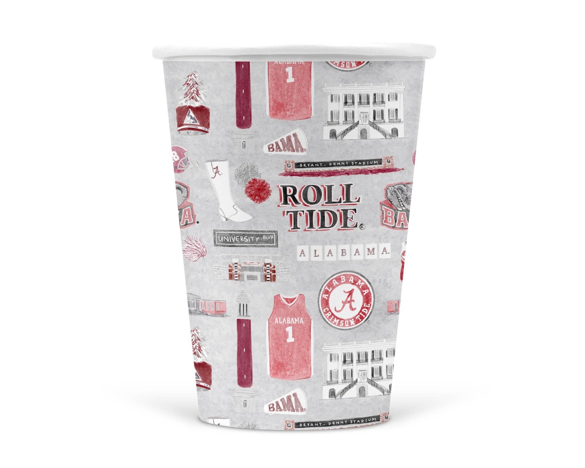 10.5 oz MATTE paper cups featuring Alabama icons, such as Bryant-Denny Stadium, a shaker, a cheerleading uniform, Big Al, and more!