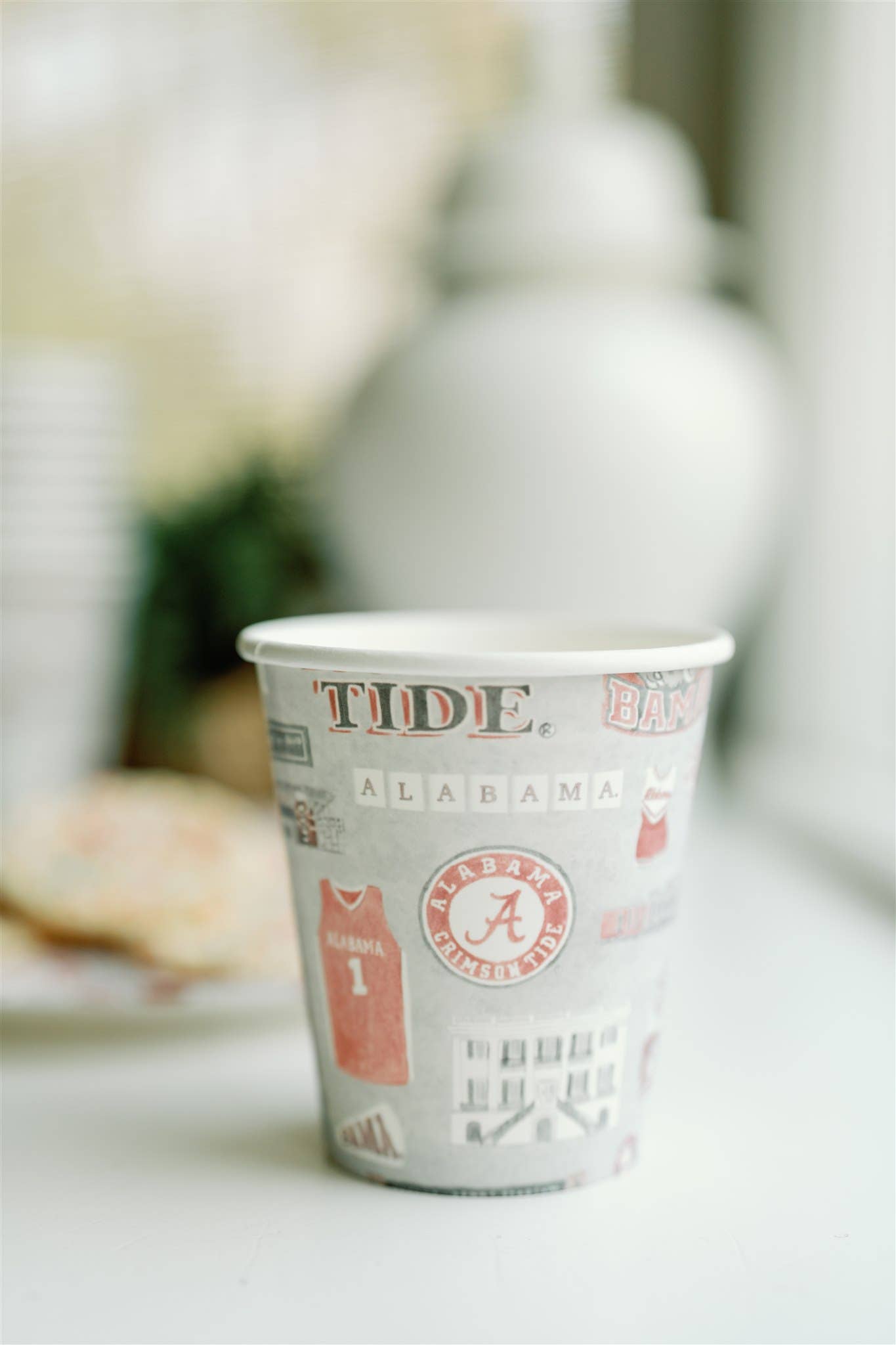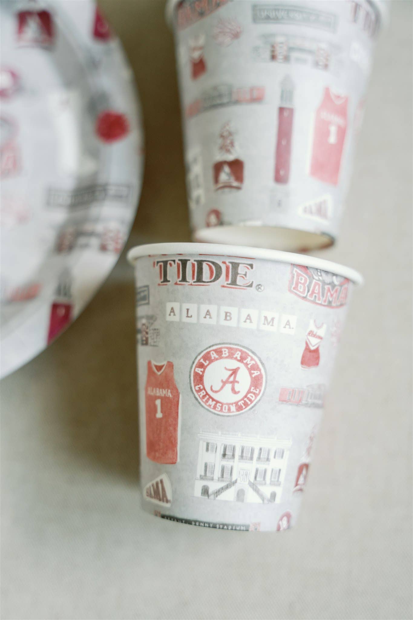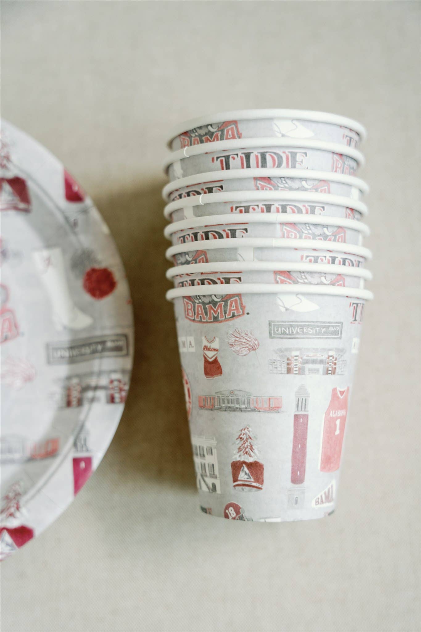 10.5 oz MATTE paper cups featuring Alabama icons, such as Bryant-Denny Stadium, a shaker, a cheerleading uniform, Big Al, and more!