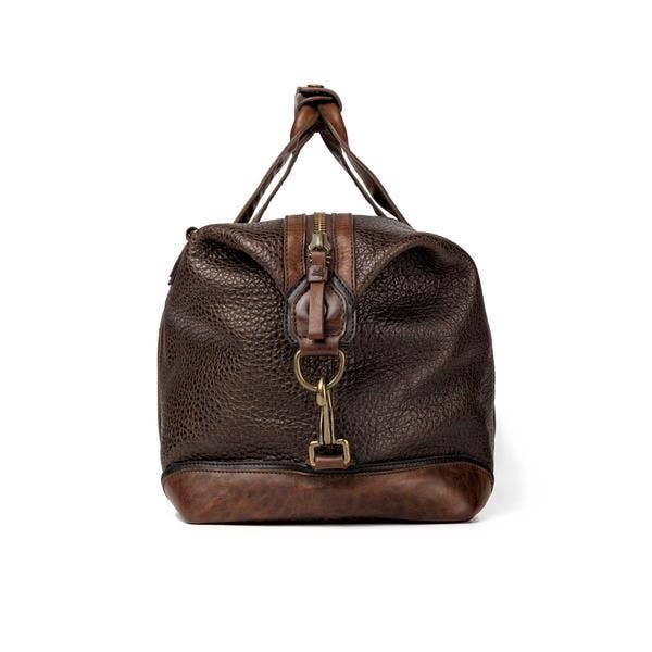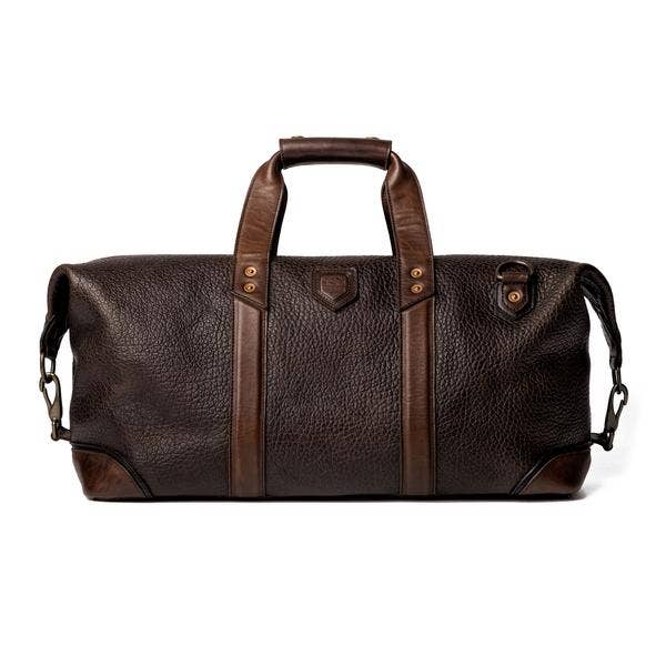 Our Theodore Leather Weekender sports an expansive 22" top zippered, dog-eared opening (actually 3" wider than the bag) for easy access loading / unloading. Generous interior with six leather bound pockets and one large, interior zippered pocket. Exterior pocket for passport or phone.